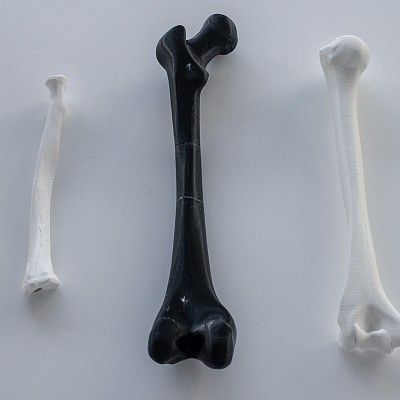 We can produce educational or custom bone simulations in small batches. The bones are made with a solid polyurethane surface and a rigid foam polyurethane interior, with a hollow core if required. We currently have moulds for bones of the upper arm, forearm, thigh and lower leg. On request, we can make silicone moulds based on segmented 3D models from physical samples, 3D scans or medical image samples, which can be used to mould 20-40 products.