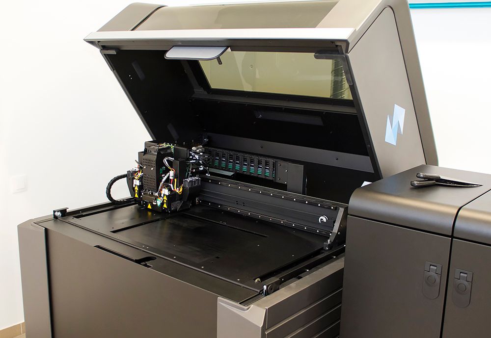 Our PolyJet device works with photopolymer materials. During the process, the head injects a liquid polymer resin layer by layer onto the work surface and then illuminates it with UV light.